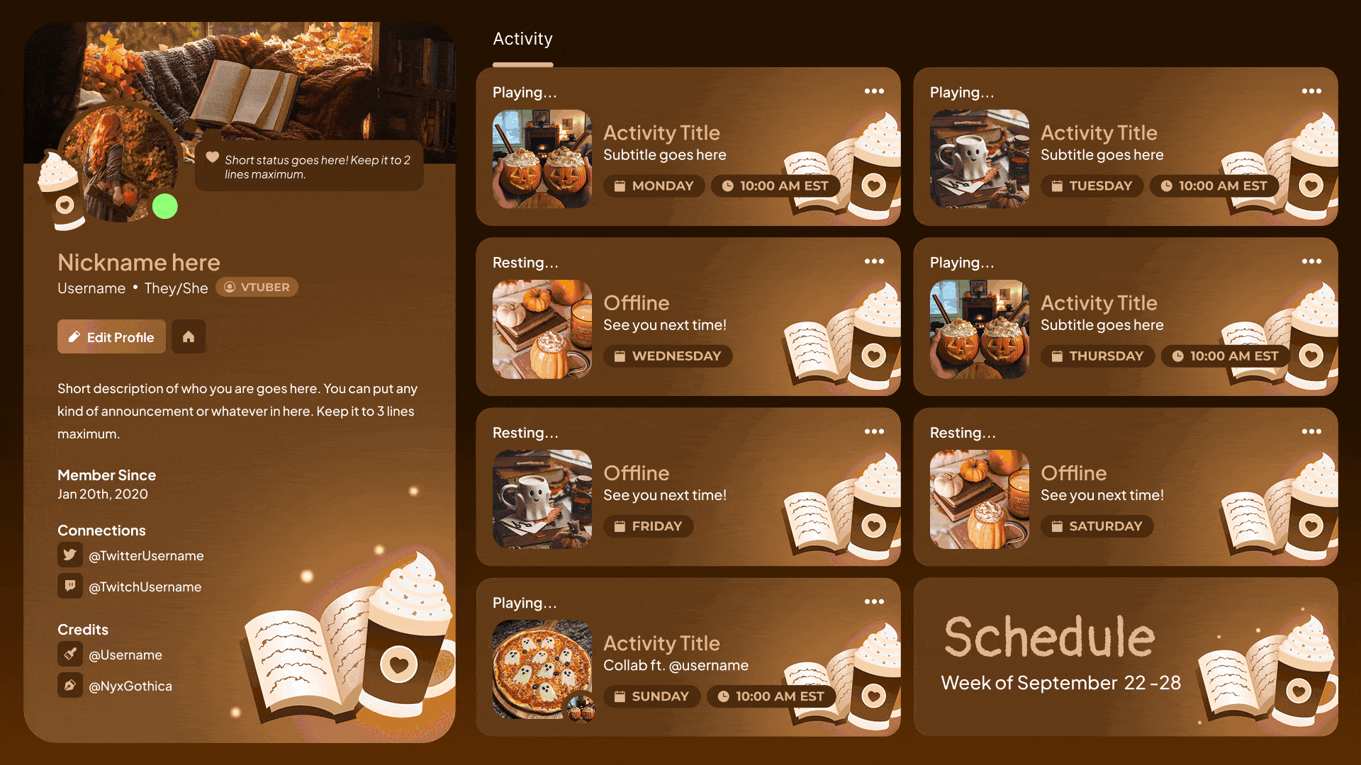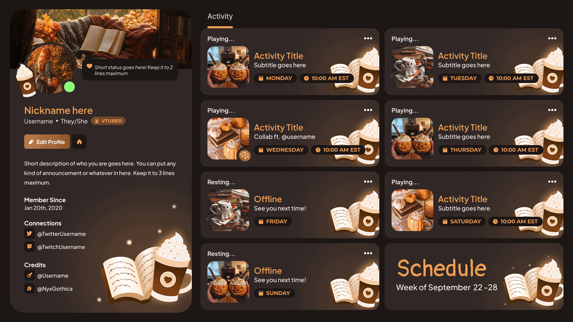 Fall & Halloween edition of the Discord-inspired stream schedule for VTubers and Streamers! This is a sleek, customizable template for sharing your stream schedule with your community!