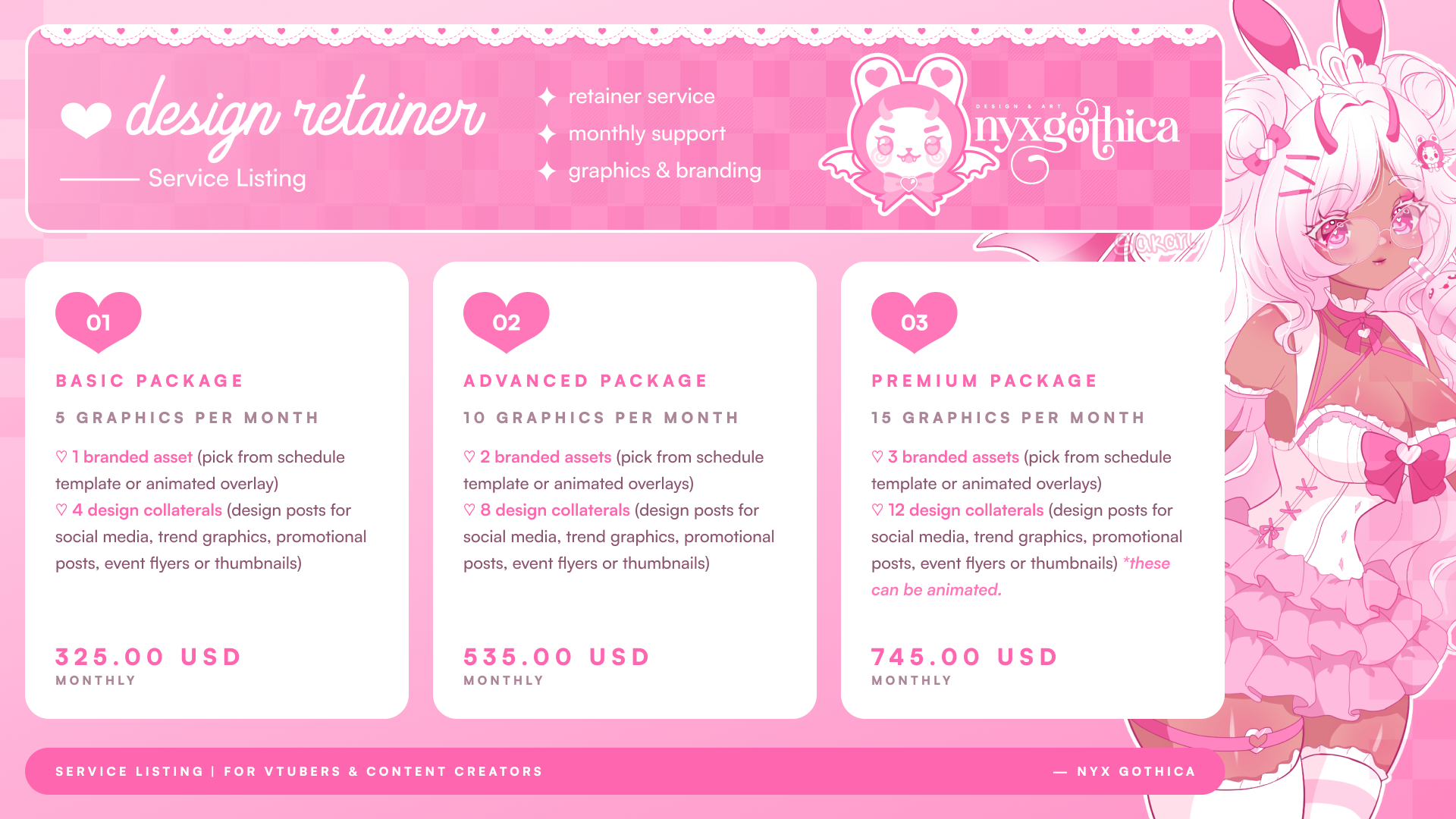 If you have a specific amount of deliverables you need, or if the amount varies per month, I can create a personalized package for you depending on your needs.